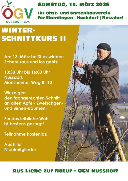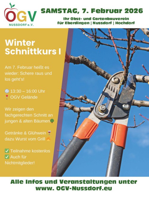 Der erste Schnittkurs im neuen Jahr findet am Samstag, 7. Februar 2026 um 13:30 Uhr in Nussdorf statt. Treffpunkt am OGV-Vereinsheim!