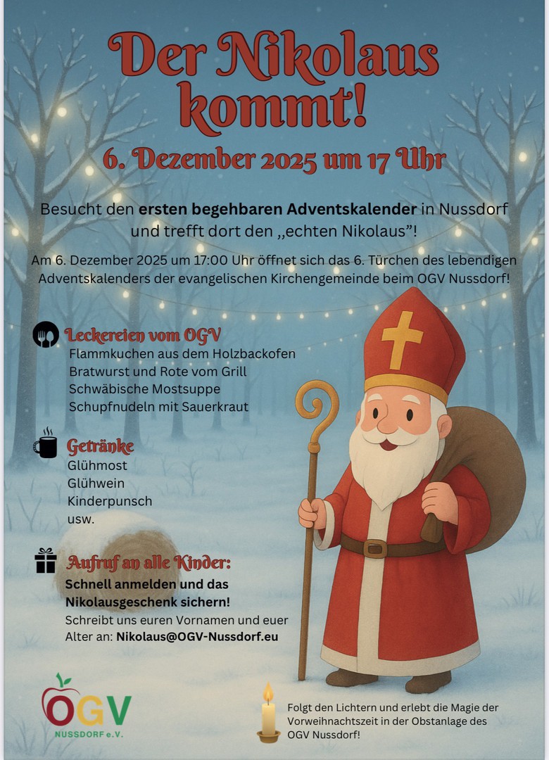 Der OGV-Nussdorf lädt in diesem Jahr zu einem ganz besonderen vorweihnachtlichen Erlebnis ein: Zum ersten Mal öffnet sich in der Obstanlage des Vereins eine begehbare Adventskalendertür und verwandelt die Anlage in eine stimmungsvolle Adventslandschaft. Freuen Sie sich auf ein einzigartiges Erlebnis, das Tradition und Kreativität auf besondere Weise verbindet.